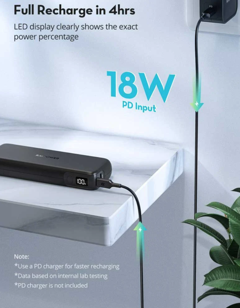 - شاحن محمول RAVPower PD مع منفذ USB-C بقوة 18 واط (PD 3.0) ومنفذ USB-A بقوة 12 واط (QC)، للشحن المتزامن لجهازين.